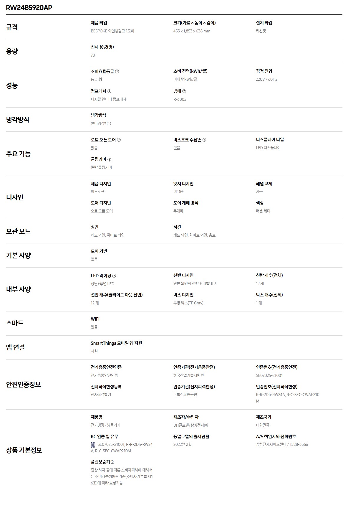 [진열]삼성 Bespoke 키친핏 와인냉장고 RW24B5920AP