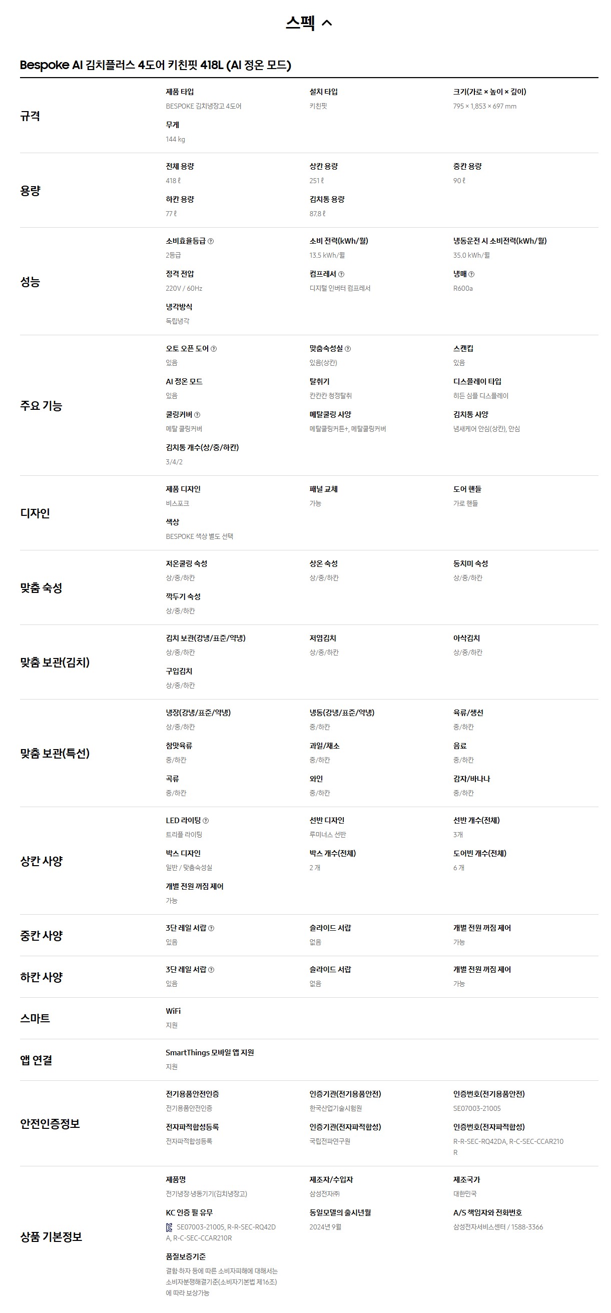 삼성 비스포크 AI 김치플러스 4도어 키친핏 418L 김치냉장고 RQ42DB94Q2AP