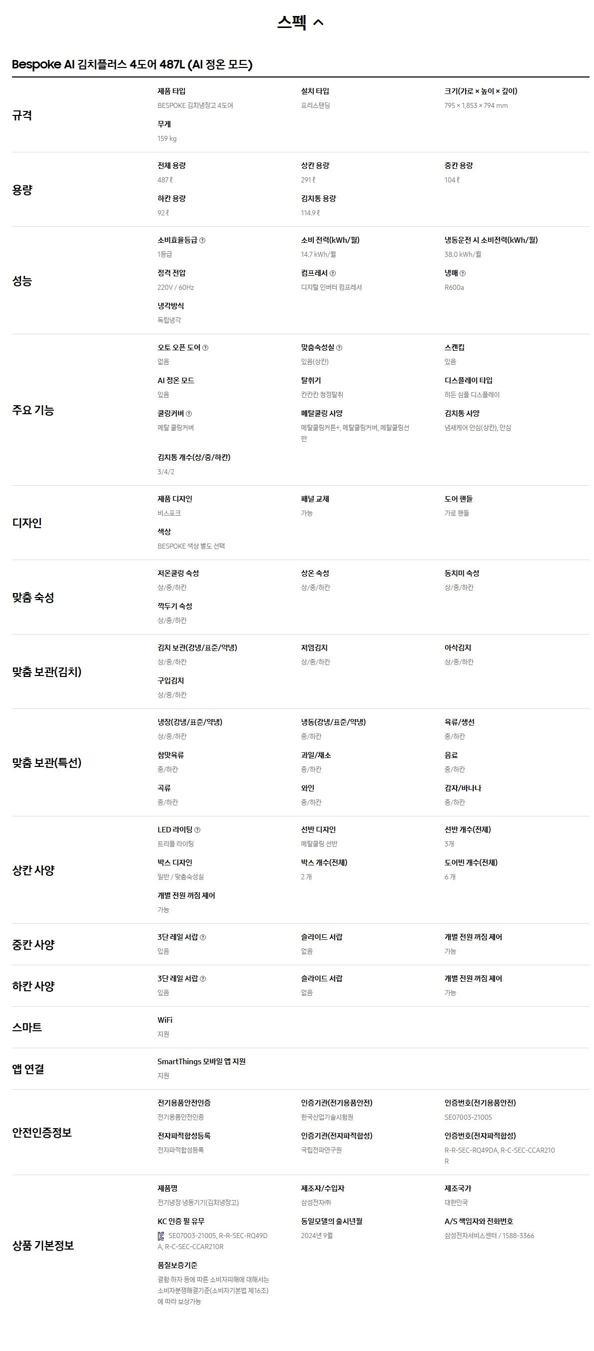 삼성 비스포크 AI 김치플러스 4도어 키친핏 김치냉장고 487L RQ49DB9411AP